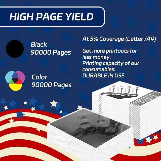 High Capacity: Our products are designed to print more pages, with large capacities that reduce the frequency of replacement. Black (BK/K) Print Pages: 90000 pages. Color Print Pages: 90000 pages (5% coverage on A4 paper)