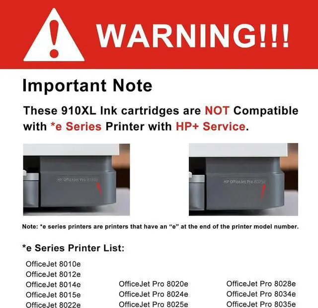 This cartridge works with: HP OfficeJet 8010, 8015, 8018, 8022; HP Officejet Pro 8020, 8025, 8028,8034, 8035 printers. These 910xl black and color combo pack are NOT Compatible with *e Series Printers with HP+ Service (Such as OfficeJet 8010e, 8012e, 8014e, 8015e, 8022e,OfficeJet Pro 8020e, 8024e, 8025e, 8028e,8035e Printer).
