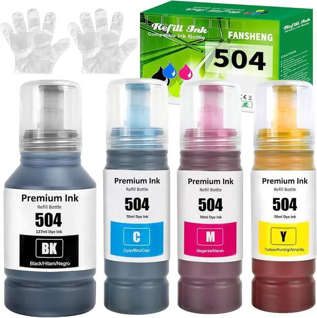 Package ContentsIncludes a total of 4 Compatible 504 ink refill bottles 1xT504 Black ink refill bottles, 1 x T522 Cyan ink refill bottles, 1 x T522 Magenta ink refill bottles, and 1 x T522 Yellow ink refill bottles. 1 pair of gloves for easy handling.
