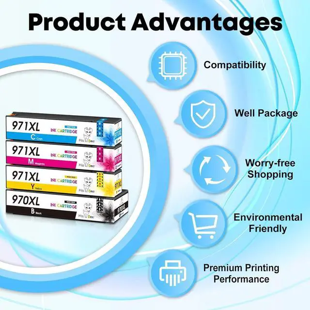 What you get : 4 pack of compatible 970XL 971XL High Yield ink cartridges (1 Black, 1 Cyan, 1 Magenta, 1 Yellow)