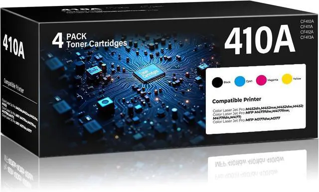 Package Included: 410A toner cartridges 4 pack compatible for HP 410A toner cartridges contains 1 x 410A Black toner(CF410A), 1 x 410A Cyan toner(CF411A), 1 x 410A Yellow toner(CF412A), 1 x 410A Magenta toner(CF413A)