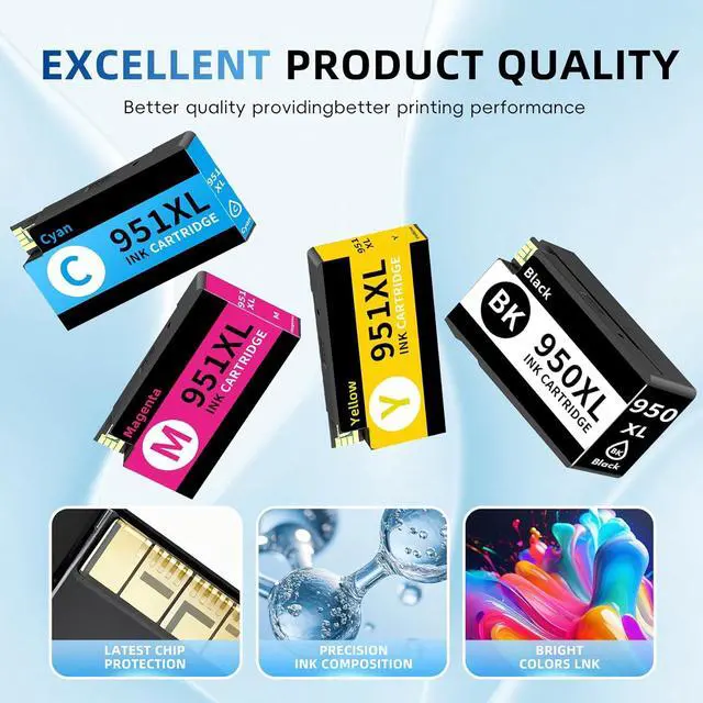 Package Contents: 4 Pack High Yield 950XL/951XL Ink Cartridge Compatible Replacement for HP950XL/951XL HP950/951 950/951 XL ( 1 Black + 1 Cyan+1 Magenta+1 Yellow)