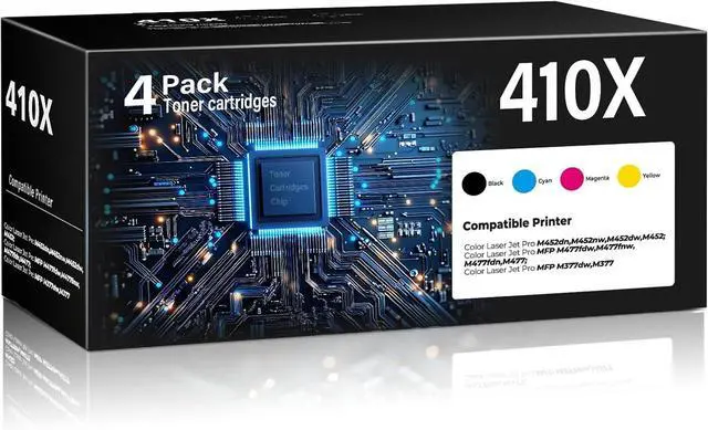 Package Included: 410X toner cartridges 4 pack compatible for HP 410X toner cartridges contains 1 x 410X Black toner(CF410X), 1 x 410X Cyan toner(CF411X), 1 x 410X Yellow toner(CF412X), 1 x 410X Magenta toner(CF413X)
