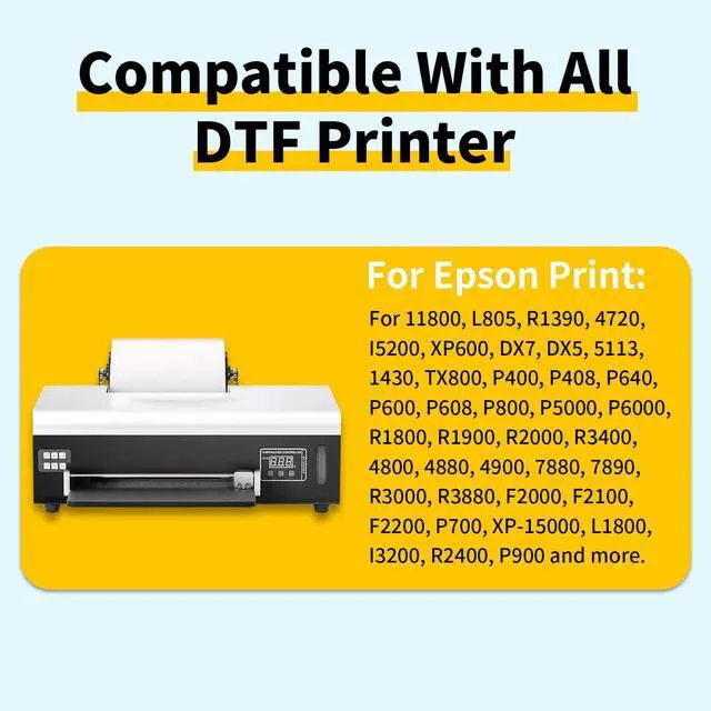 Wide Printer & Printhead Compatibility: Broad Printer Compatibility across desktop, A3, and wide-format DTF setups. Compatible printer and printhead series include L1800, L805, R1390, 1430, XP-15000, ET8550,TX800, 4720, I3200, XP600, DX5, DX7, 5113, P400P800, P5000/P6000, R1800R3880, 48004900, 7880/7890, F2000F2200, P700, P900, and more DTF-converted Eps printers.