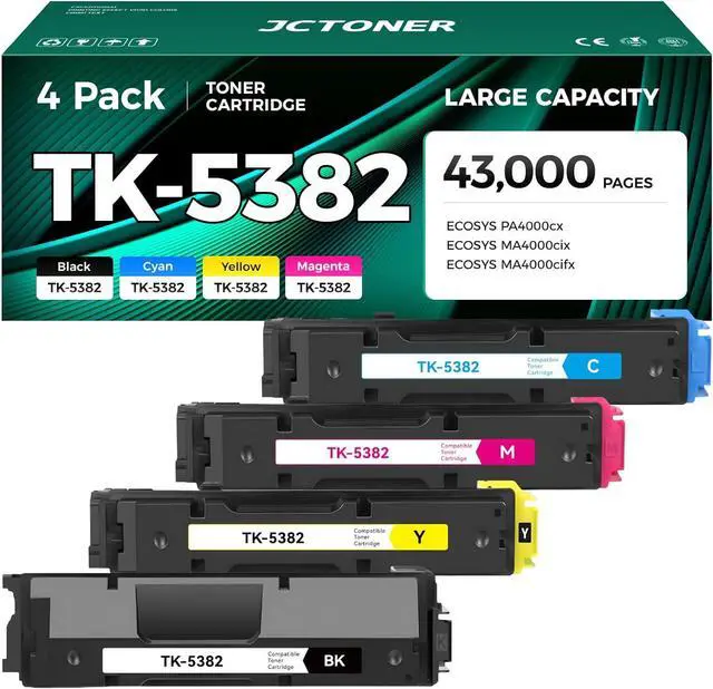 • Package Contents: 4-Pack TK5382 TK-5382 TK-5382K TK-5382C TK-5382M TK-5382Y Toner Cartridge, 1*Black 1T02Z00US0 toner, 1*Cyan 1T02Z0CUS0 toner, 1*Magenta 1T02Z0BUS0 toner, 1*Yellow 1T02Z0AUS0 toner.