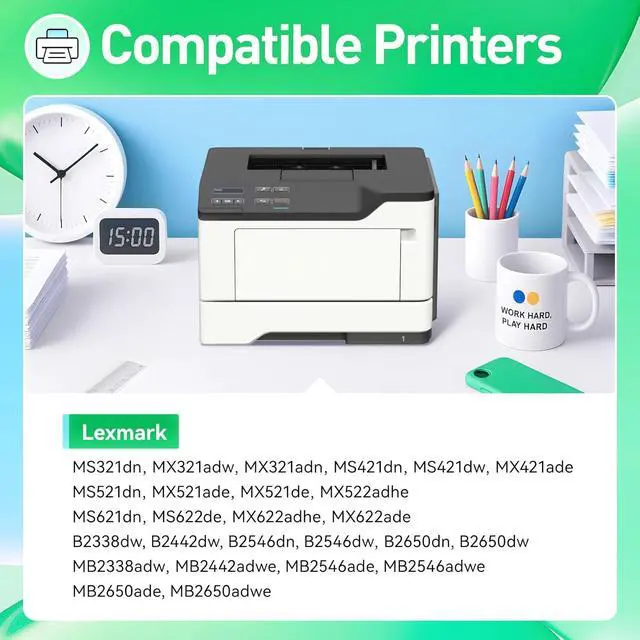 Compatible Printers: Compatible with Lexmark MS321dn MX321adw MX321adn MS421dn MS421dw MX421ade MS521dn MX521ade MX521de MX522adhe MS621dn MS622de MX622adhe MX622ade B2338dw B2442dw B2546dn B2546dw B2650dn B2650dw MB2338adw MB2442adwe MB2546ade MB2546adwe MB2650ade MB2650adwe Series Printer.