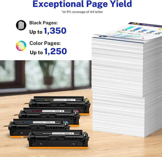 Estimate Cartridge Yield: Up to 1,350 pages per 206A W2110A black toner cartridge and 1,250 pages per 206A W2111A W2112A W2113A color toner cartridge (Letter/A4, at 5% coverage)