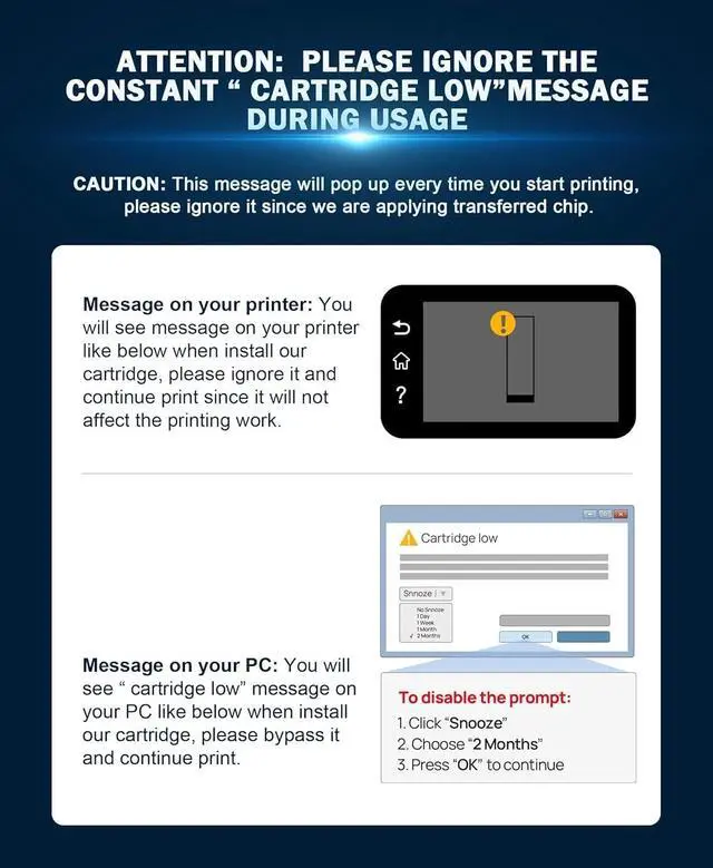Low Ink Alert: Printers using our 134A toner cartridge cannot display the remaining toner level, but this will not affect printing quality or page yield. When installing the cartridge, you may see a "cartridge low" message on your PC. Please disregard it and continue printing.