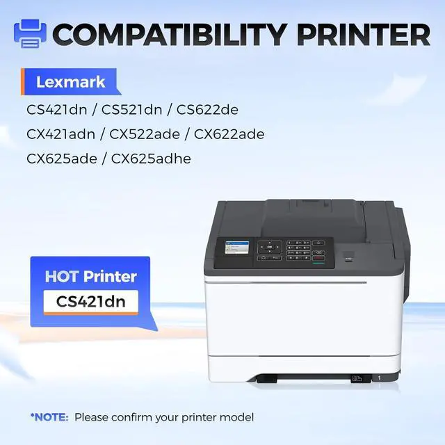 Compatible Printer: Compatible with Lexmark CS421,CS521,CS622,CX421,CX522,CX622,CX625,CS421dn,CS521dn,CS622de,CX421adn,CX522ade,CX622ade,CX625ade,CX625adhe Series Printers.