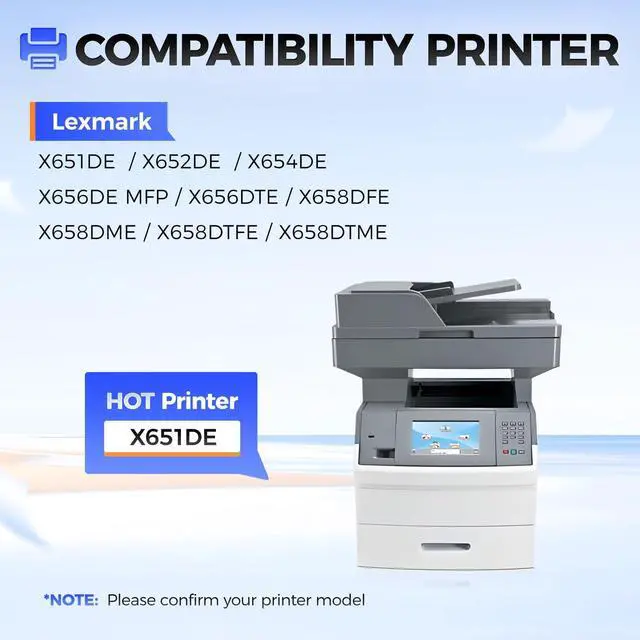 Compatible Printer: Compatible with Lexmark X651DE X652DE X654DE X656DE MFP X656DTE X658DFE X658DME X658DTFE X658DTME Laser Printers.