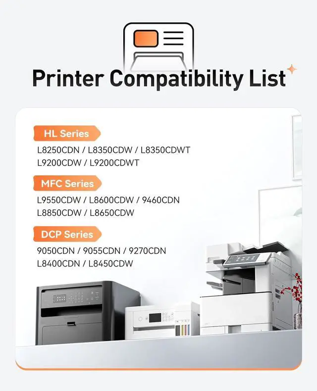 Compatible Printers: Compatible with Brother DCP-9050CDN,DCP-9055CDN,DCP-9270CDN,DCP-L8400CDN,DCP-L8450CDW HL-L8250CDN,HL-L8350CDW,HL-L8350CDWT,HL-L9200CDW,HL-L9200CDWTMFC-L9550CDW,MFC-L8600CDW,MFC-9460CDN,MFC-L8850CDW,MFC-L8650CDW Series Printer.