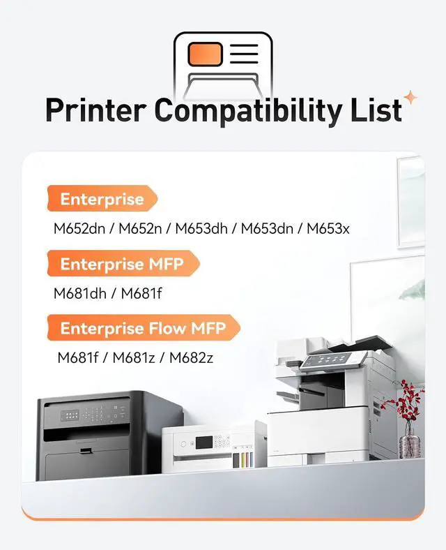 Compatible Printer:Compatible for HP Color LaserJet Enterprise Flow MFP M681f, M681z, M682z; HP Color LaserJet Enterprise M652dn, M652n, M653dh, M653dn, M653x; HP Color LaserJet Enterprise MFP M681dh, M681f Series Printer