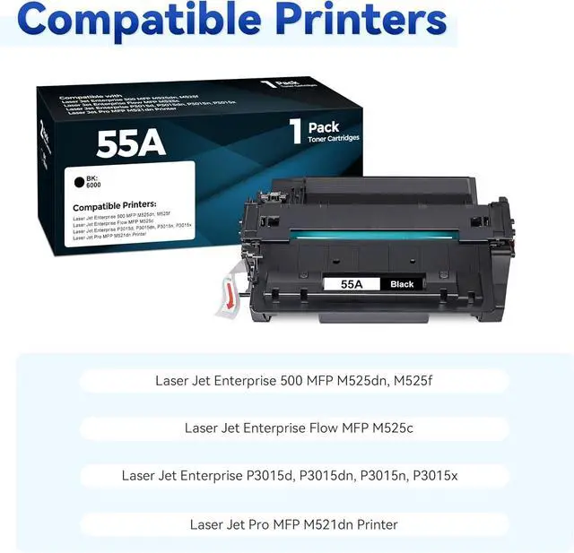 Printer Compatibility: Compatible for HP Laser Jet Enterprise 500, MFP M525, M525dn, M525f; Laser Jet Enterprise Flow MFP M525c; Laser Jet Enterprise P3015d, P3015dn, P3015n, P3015x P3016; Laser Jet Pro MFP M521 M521dn M521dw Printers