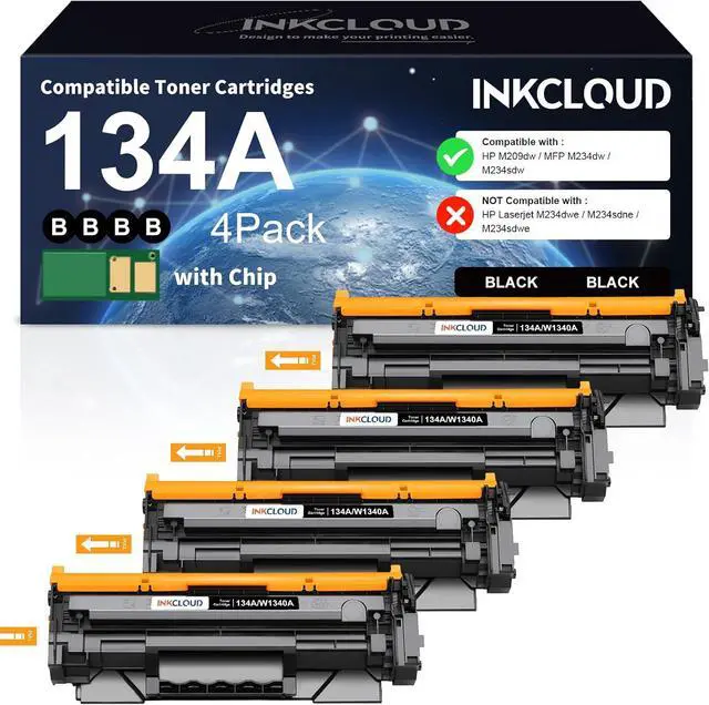 Package Contents: 4x 134A Black Toner Cartridges with CHIP high yield replacement for HP 134A W1340A (with CHIP).