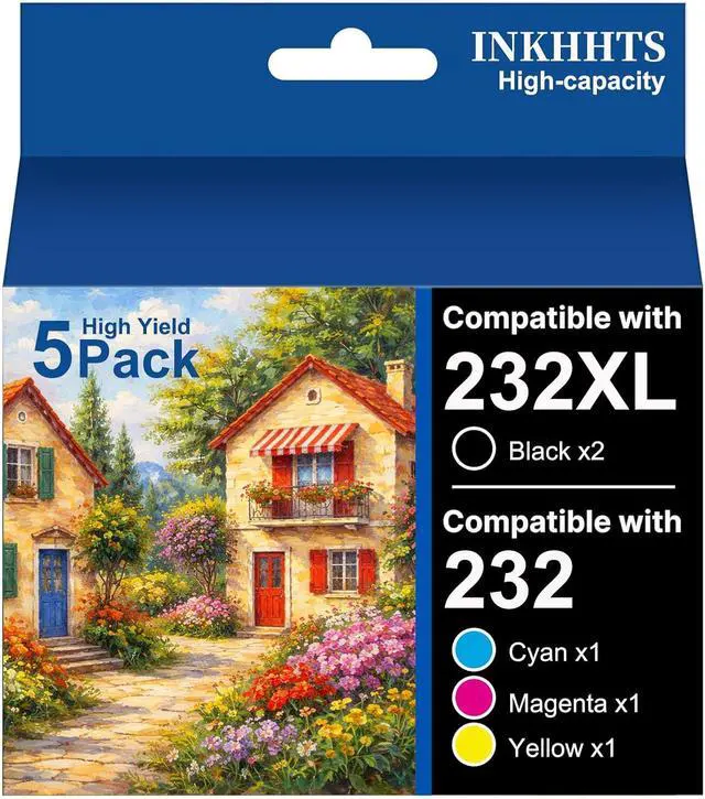Package Contents: Remanufactured for Epson 232XL ink cartridges combo pack includes: 2× Black 232XL ink cartridge, 1× Cyan 232 ink cartridge, 1× Magenta 232 ink cartridge, and 1× Yellow 232 ink cartridge