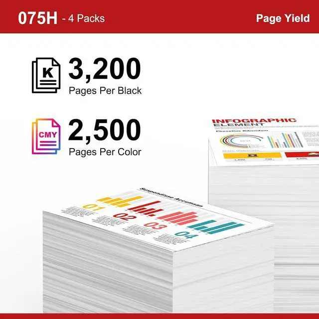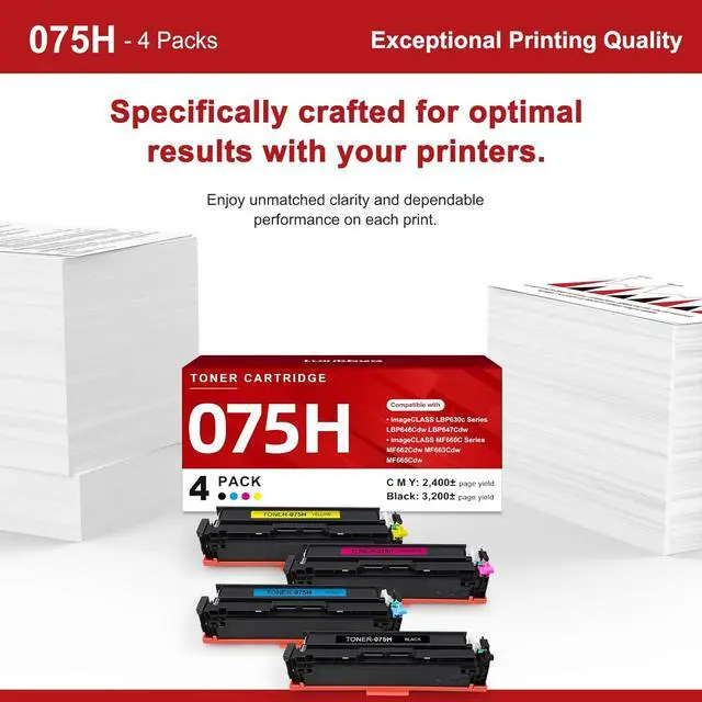 Package Includes 4-Pack 075H toner cartridges: 075 H Black (6369C001), 075 H Cyan (6368C001), 075 H Yellow (6366C001), 075 H Magenta (6367C001). Convenient full set packaging makes replacement easier and printing more efficient.
