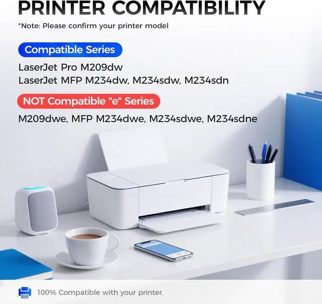 Perfect Compatibility: Compatible for HP devices M209dw MFP M234dw M234sdw M234sdn; NOT Compatible for "e" Series M209dwe M234dwe M234sdwe M234sdne Printer.