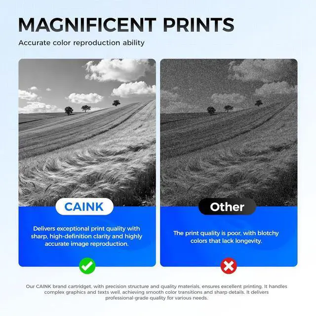 CAINK toner cartridges are ISO-9001 and ISO-14001 certified. Each toner cartridge undergoes a strict quality testing procedure, delivering excellent print quality from the first page to the last. Use our Cartridge to avoid toner leaks, premature failures or dangerous code as much as possible.