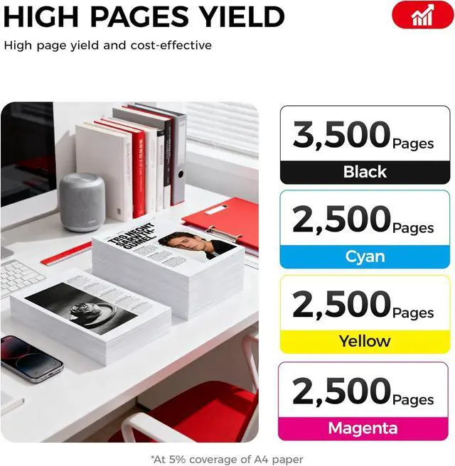 High Pages Yield: 075 H black toner cartridge can print up to 3,500 pages, and per color toner cartridges can print 2,500 pages to meet high frequency printing needs. (Based on 5% coverage rate).