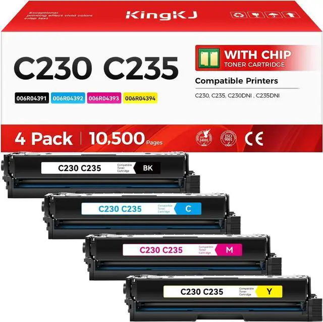 • Package contentstotal 4-Pack C230/C235 Toner Cartridges Combo Set with chip Compatible for Xerox C230/C235 006R04391 006R04392 006R04393 006R04394 (1 Black, 1 Cyan, 1 Magenta, 1 Yellow).