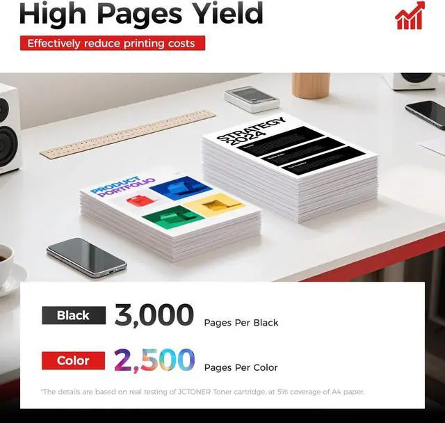 • Page YieldUp to Black is 3,000 pages per black Toner Cartridges and Color is 2,500 Pages per color Toner Cartridges (Letter/A4, at 5% Coverage).