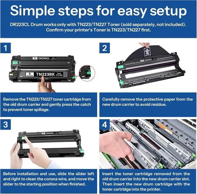 Package Contents: ACQMKINK DR223CL DR-223CL Drum Unit Set 4 Pack (1Black/1Cyan/1Magenta/1Yellow), Not Include Toner Cartridge