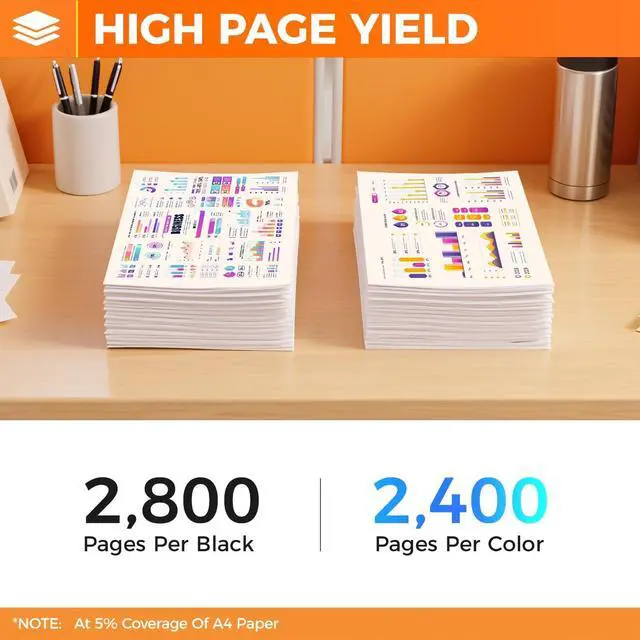 High Capacity: K:2,800, CMY 2,400 Pages at 5% Coverage (Letter /A4)