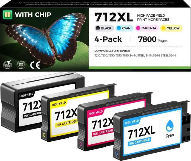 Package contentstotal 4-Pack 712XL Ink Cartridges Combo Set with chip Compatible for HP 712XL (1 Black, 1 Cyan, 1 Magenta, 1 Yellow).