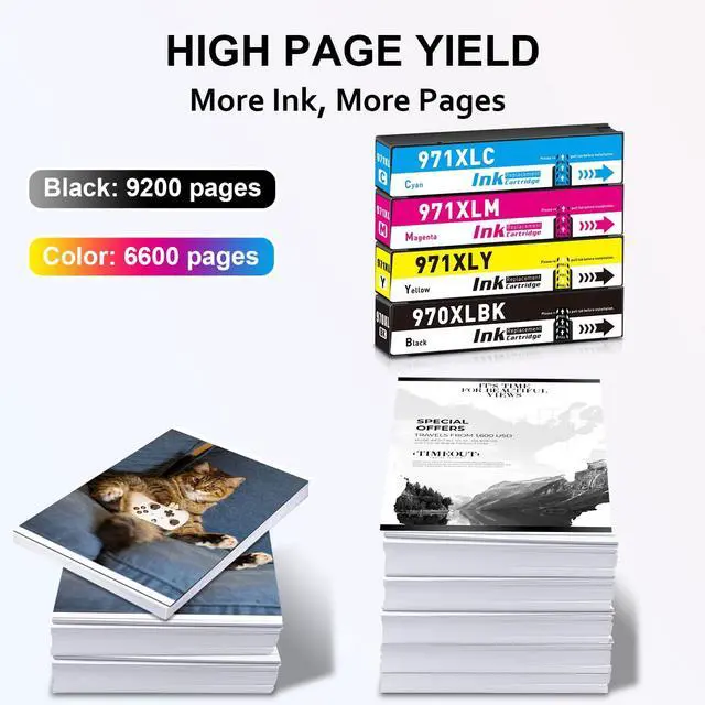 Premium Ink Output Up to 9200 pages per 970xl black ink cartridge, 6600 pages per 971xl Cyan / Magenta / Yellow ink cartridge (at 5% coverage on A4 paper)
