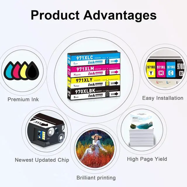 Package Content 1 x 970xl ink black, 1 x 971xl ink cyan, 1 x 971 ink magenta, 1 x 971 ink yellow, 1 x glove.