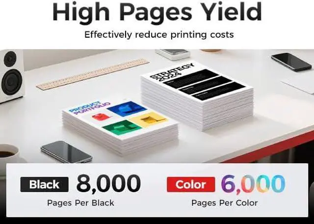 High Yield : Black is about 8,000 pages per and Color is about 6,000 pages toner cartridge at 5% coverage