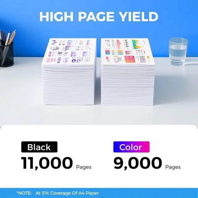 High Yield: Black: 11,000 pages Colour: 9,000 pages at 5% coverage (Letter/A4)