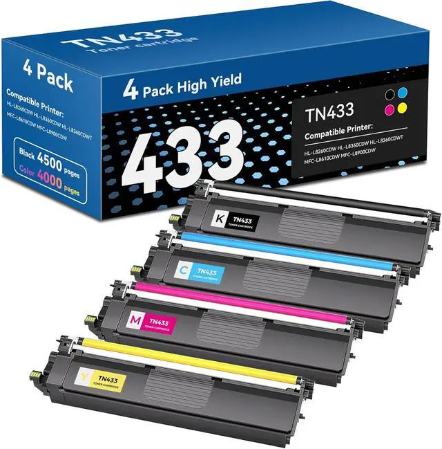 Package Included: 4 Pack High Yield TN433 TN-433 Toner Cartridges. Color: 1 Black, 1 Cyan, 1 Magenta, 1 Yellow