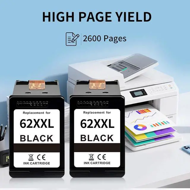 5X Large Capacity | High Page Yield: The latest generation of ultra-high capacity 62 black ink cartridges has 5 times the ink of standard cartridges. Two 62XXL black cartridges can print at least 2,600 pages