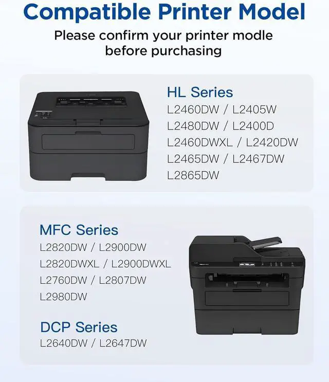 • Printer Compatibility: Compatible with DCP-L2640DW, DCP-L2647DW, HL-L2400D, HL-L2405W, HL-L2420DW, HL-L2460DW, HL-L2460DWXL, HL-L2465DW, HL-L2467DW, HL-L2480DW, HL-L2865DW, MFC-L2760DW, MFC-L2807DW, MFC-L2820DW, MFC-L2820DWXL, MFC-L2900DW, MFC-L2900DWXL, MFC-L2980DW printer