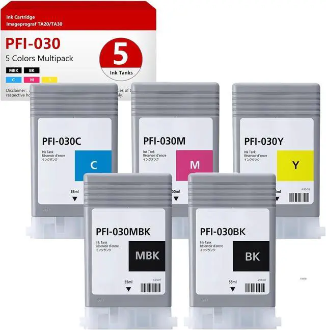 Package Contents: 5 Pack Compatible Canon PFI-030 Ink Cartridge (PFI-030MBK, PFI-030BK, PFI-030C, PFI-030M, PFI-030Y), Pigment Ink.