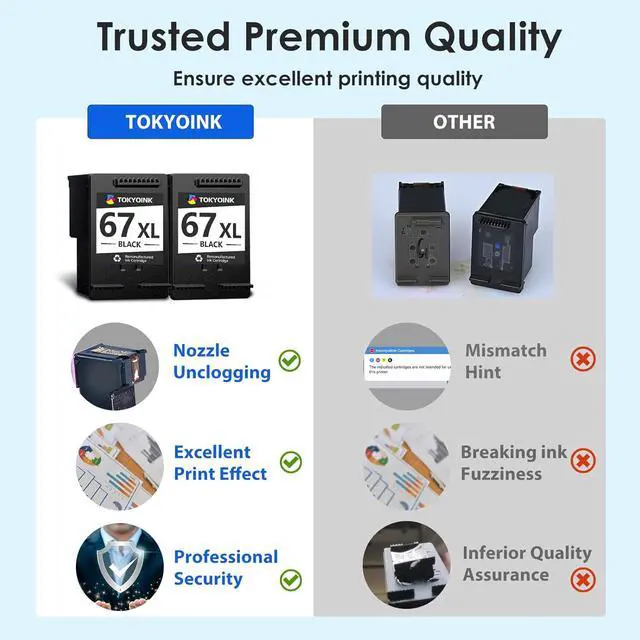 Exceptional service with all TOKYOINK replacement for 67xl hp printer ink undergoing strict inspection and ISO9001 and ISO14001 certification. Also our team offers you 2-year safeguard, 24/7 customer service and 100% exchange for defective product.