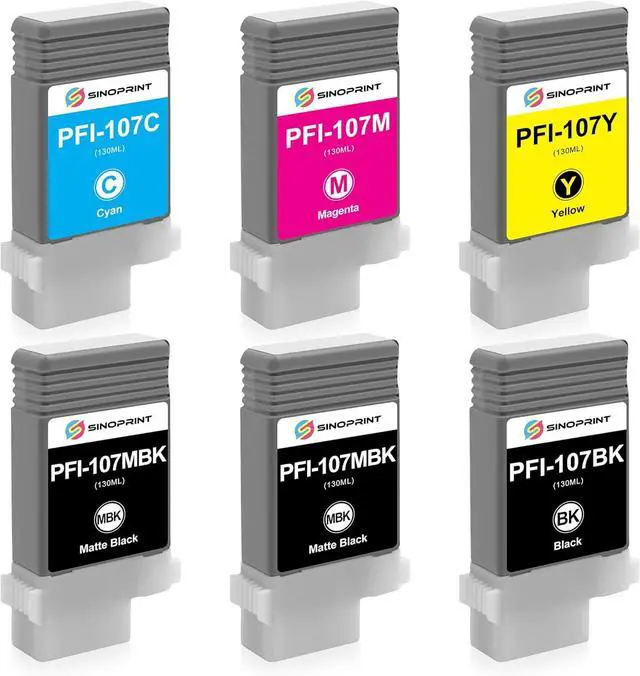 Package Includes: 6 Packs PFI-107 PFI-107MBK Matte Black *2, PFI-107BK Black *1, PFI-107C Cyan *1,PFI-107M Magenta *1, PFI-107Y Yellow *1.
