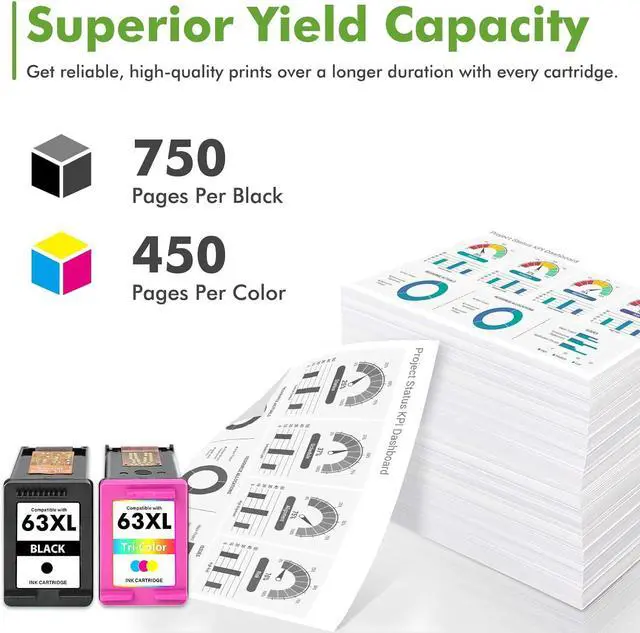 High Page Yield: It yields up to 750 pages for each 63XL Black Ink and 450 pages for each 63XL Color Ink at 5% coverage (A4e letter)
