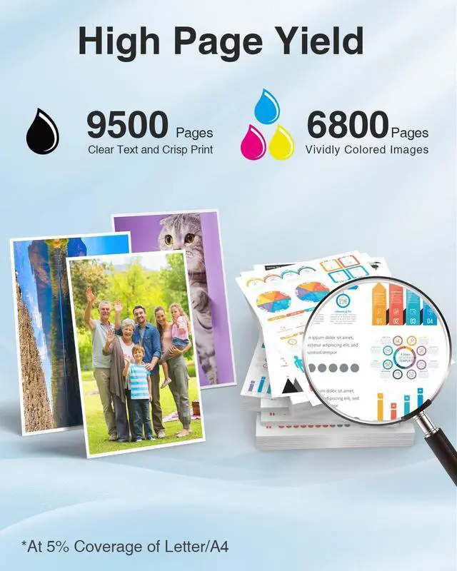 High-Yield Printing Capacity: 970XL black ink cartridges produce up to 9,500 pages and 971XL color ink cartridges 6,800 pages (A4 paper coverage rate 5%) last longer, require less replacements and offer large savings.
