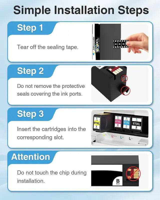 Package Contents: A total of 4 packs of 970XL 971XL ink cartridges, 1x 970XL Black ink, 1x 971XL Cyan ink, 1x 971XL Magenta ink, 1x 971XL Yellow ink. Each 970XL 971XL ink cartridge is packaged independently to ensure that the product does not leak ink and damage.