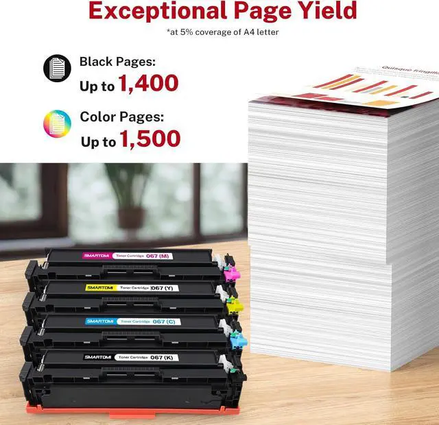Estimate Cartridge Yield: Up to 1,400 pages per 067 black toner cartridge, 1,300 pages per 067 color toner cartridges (Letter/A4, at 5% coverage)