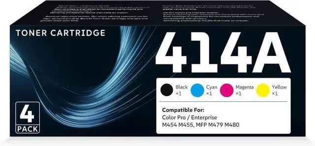 What you will receive: 1 new Compatible 414A W2020A Black Toner Cartridge, 1 new Compatible 414A W2021A Cyan Toner Cartridge, 1 new Compatible 414A W2022A Yellow Toner Cartridge, 1 new Compatible 414A W2023A Magenta Toner Cartridge.