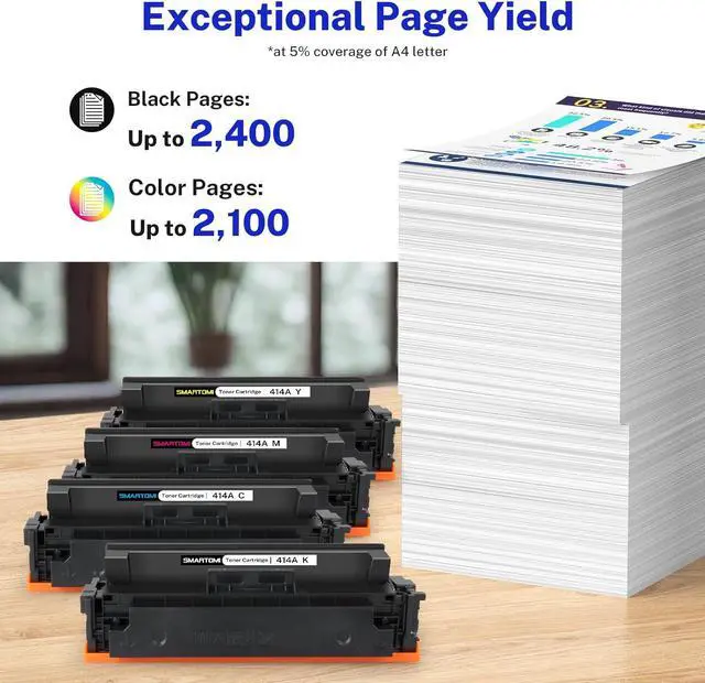 Estimate Cartridge Yield: Up to 2,400 pages per 414A W2020A black toner cartridge and 2,100 pages per 414A W2021A W2022A W2023A color toner cartridge (Letter/A4, at 5% coverage)