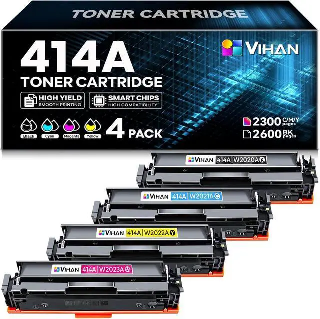 Package Contents: Vihan 414A Toner Cartridges 4 Packs (1 × 414A W2020A Black, 1 × 414A W2021A Cyan , 1 × 414A W2022A Magenta , 1 × 414A W2023A Yellow)