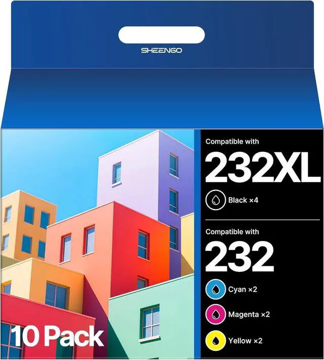 4.Package Contents: Remanufactured for epson 232xl ink cartridges combo pack including 4 x Black 232xl ink cartridge, 2 x Cyan 232 ink cartridge, 2 x Magenta 232 ink cartridge , 2 x Yellow 232 ink cartridge