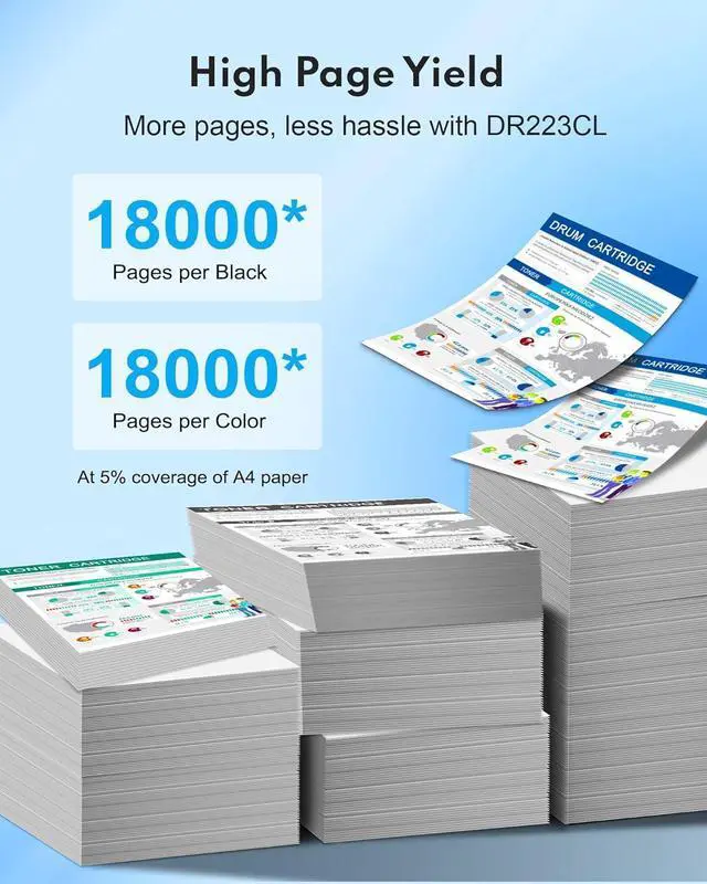 High Page Yield: Up to 18000 pages per DR223CL DR223 Drum (Letter/A4, at 5% Coverage)