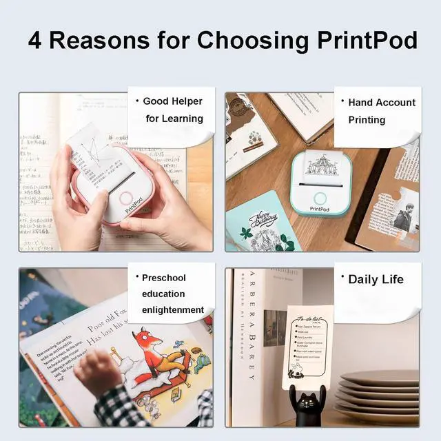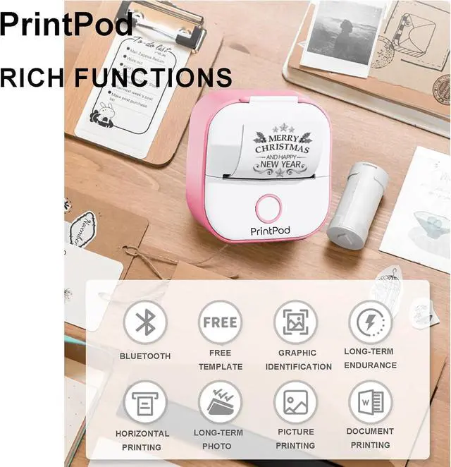 Inkless Sticker PrinterCompared to traditional printers Print Pod does not require any ink and has a built-in 1000 mAh battery for up to 1 week of operation at a low cost and small size