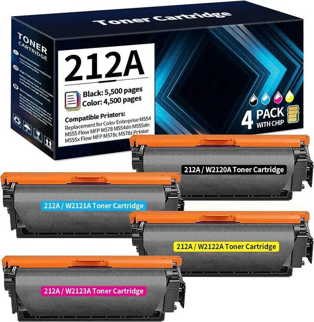 Includes 4 Pack 212A/W2120A Toner Cartridge With 1 pack black 212A W2120A toner cartridge, 1 pack cyan 212A W2121A toner cartridge, 1 pack yellow 212A