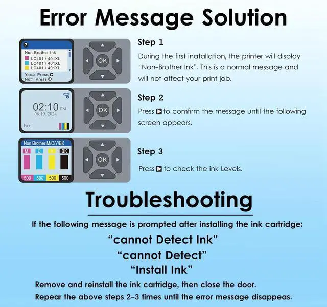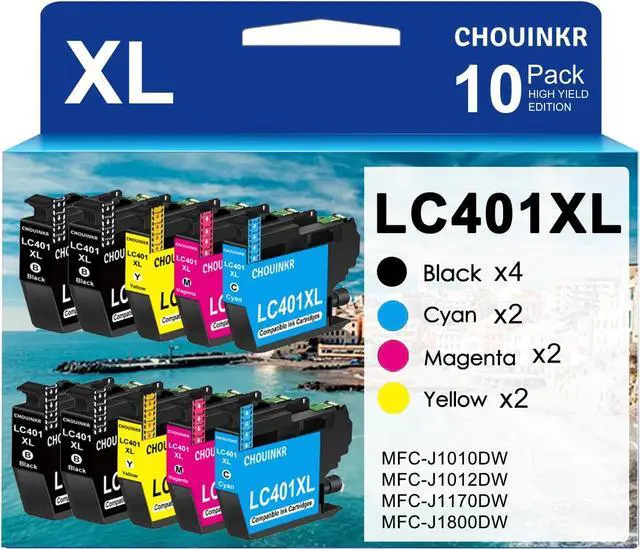 Package Content: CHOUINKR Ink Cartridges Replacement for Brother lc401xl ink cartridges combo pack Use with Brother MFC-J1010DW ink cartridges